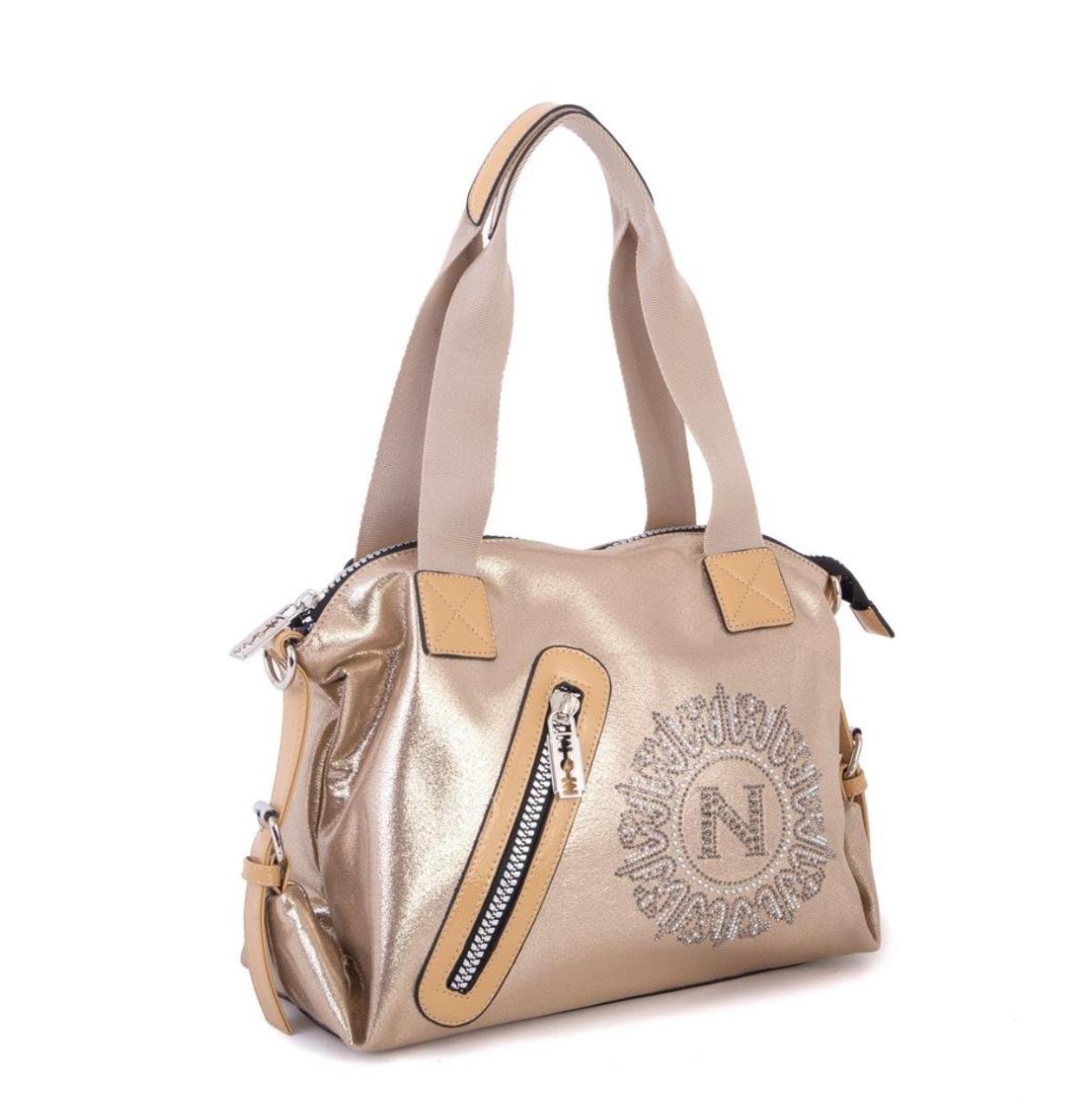 Kadın Taşlı Fermuarlı Şık Omuz Çantası ve Ayarlanabilir Askılı Altın Simli (33x30x12)