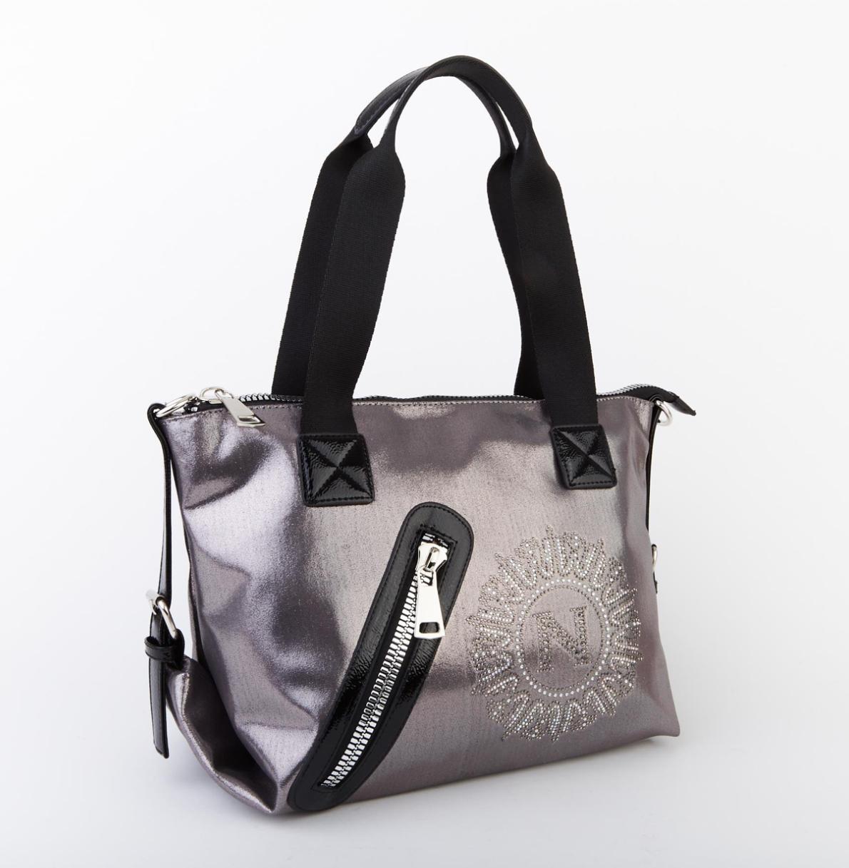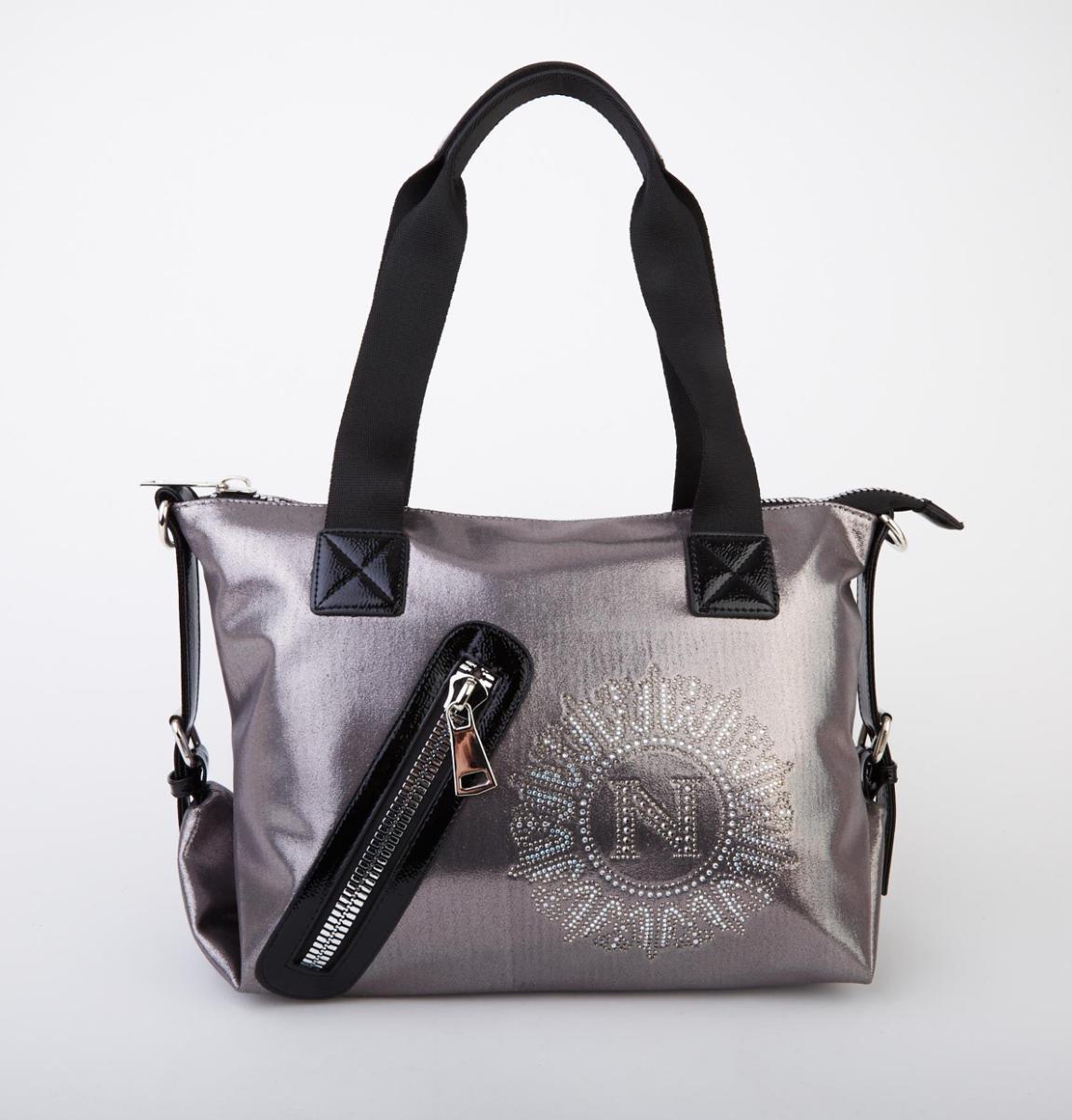 Kadın Taşlı Fermuarlı Şık Omuz Çantası ve Ayarlanabilir Askılı Gri Simli